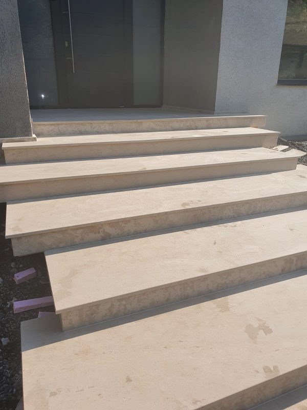 Treapta Vratza mat de 2 cm la comanda in nuante de bej-crem, o piatra eleganta prin naturaletea ei. Travertin-ul este o rocă sedimentară de calcar care are o culoare crem, gălbuie până la brună. Placajele din travertin sunt folosite în mare măsură pentru a decora un spatiu cu rafinament. Placarea cu piatra naturala travertin poate fi folosita in interior pentru peretii la baie si bucatarie, seminee, scari interioare. La peretii exteriori pe verticala la fatade, garduri, socluri, ziduri de sustinere.